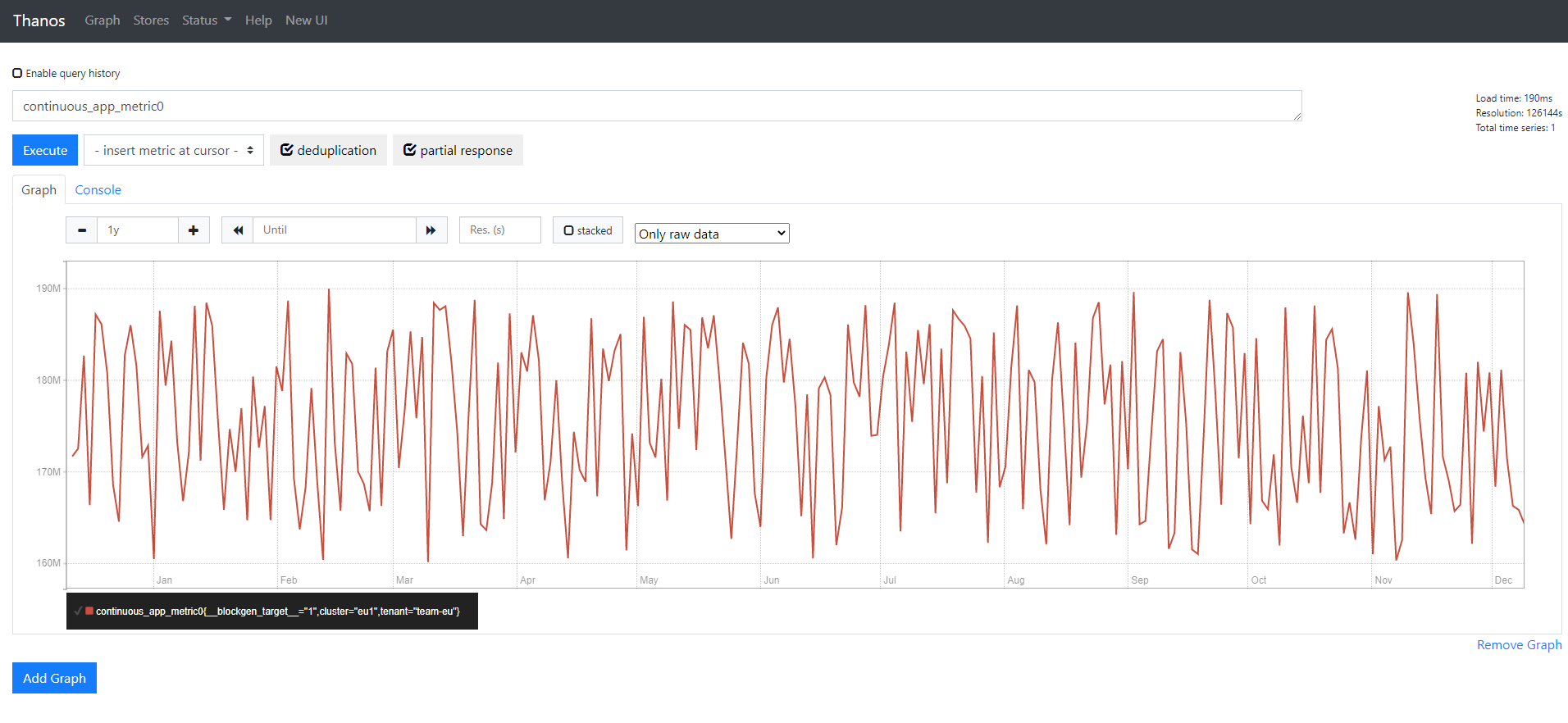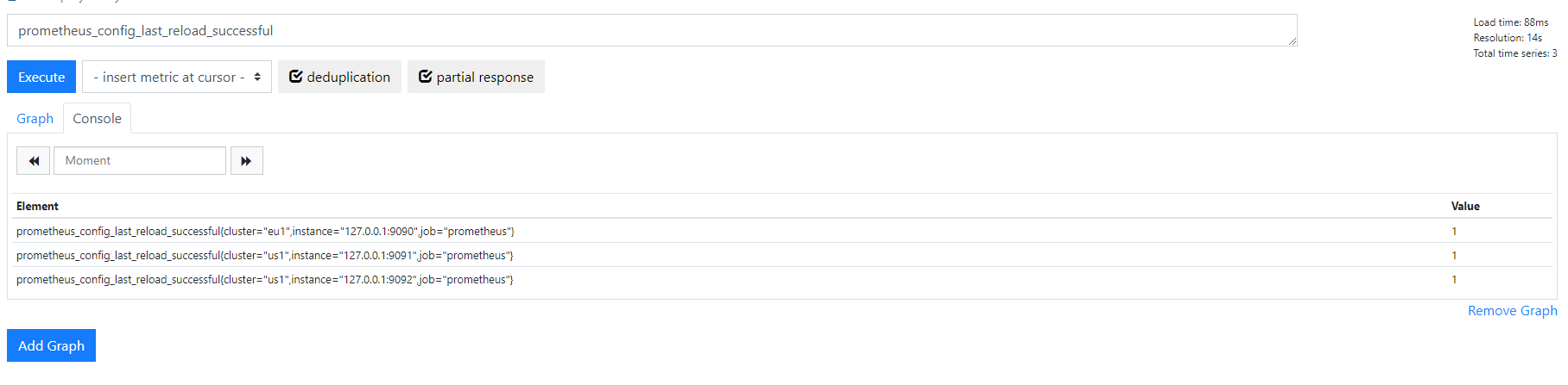 | docker stop querier && \ docker run -d --net=host --rm \ --name querier \ quay.io/thanos/thanos:v0.16.0 \ query \ --http-address 0.0.0.0:9091 \ --query.replica-label replica \ --store 127.0.0.1:19190 \ --store 127.0.0.1:19191