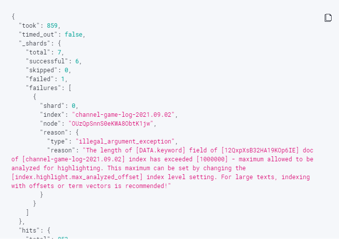 可以尝试修改index.highlight.max_analyzed_offset,增大设置,但是不建议修改很大,会导致es内存问题,默认上限为1000000,这里修改为6000000解决