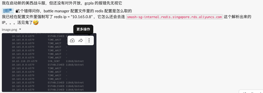但是在配置过程中却发现了一个奇怪的事情。 明明配置了指定的IP,但是程序连接的时候却直接连接到了阿里云的内网Redis IP。